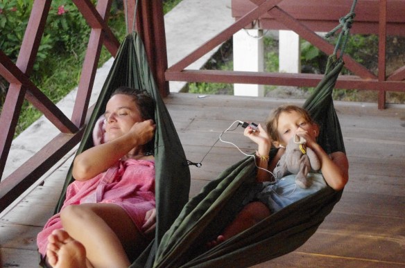 Le lendemain, c’est une grosse matinée école, Fabrice se repose, les enfants sont au calme, face à la rivière et aux chutes. Les enfants de l’hôtel (pas d’école pour eux encore) nous tournent autour intrigués. Je leur prête l’ardoise effaçable et ils s’occupent.