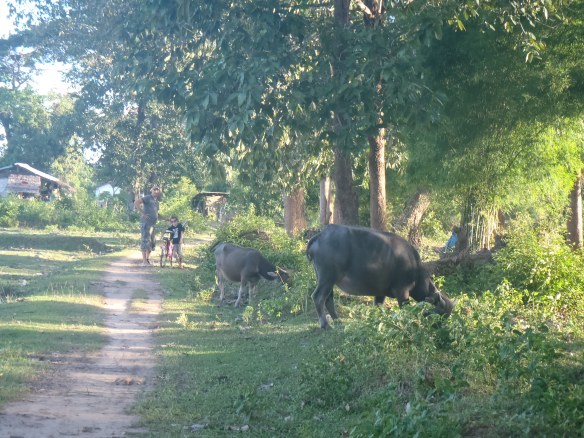 Ici, vivent en harmonie familles, veaux, vaches, cochons (dont une énorme truie obèse) poules. C’est la campagne, avec quelques guest-houses et restaurants (à recommander chez MamaPa et chez Palamai, endroits chaleureux et nourriture copieuse !). Peu de gens restent là plus d’une nuit, mais certains ont du mal à en partir ! On a croisé une espagnole qui s’y est installée, mariée avec un Lao et ouvert un petit resto…