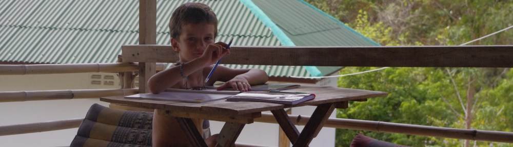 Maceo en a 8 différents, Français et Maths à faire quasiment tous les jours, les autres matières en alternance (on a laissé deux matières dans le sac de camping d’australie) quelques exercices en ligne, pas évident car le wifi fonctionne par intermittence ici… On atteint péniblement les deux heures de cours, il a tendance à ne pas trop aimer écrire ni avoir commis des erreurs en français; pour les maths, l’anglais et l’histoire, ça a l’air d’aller!