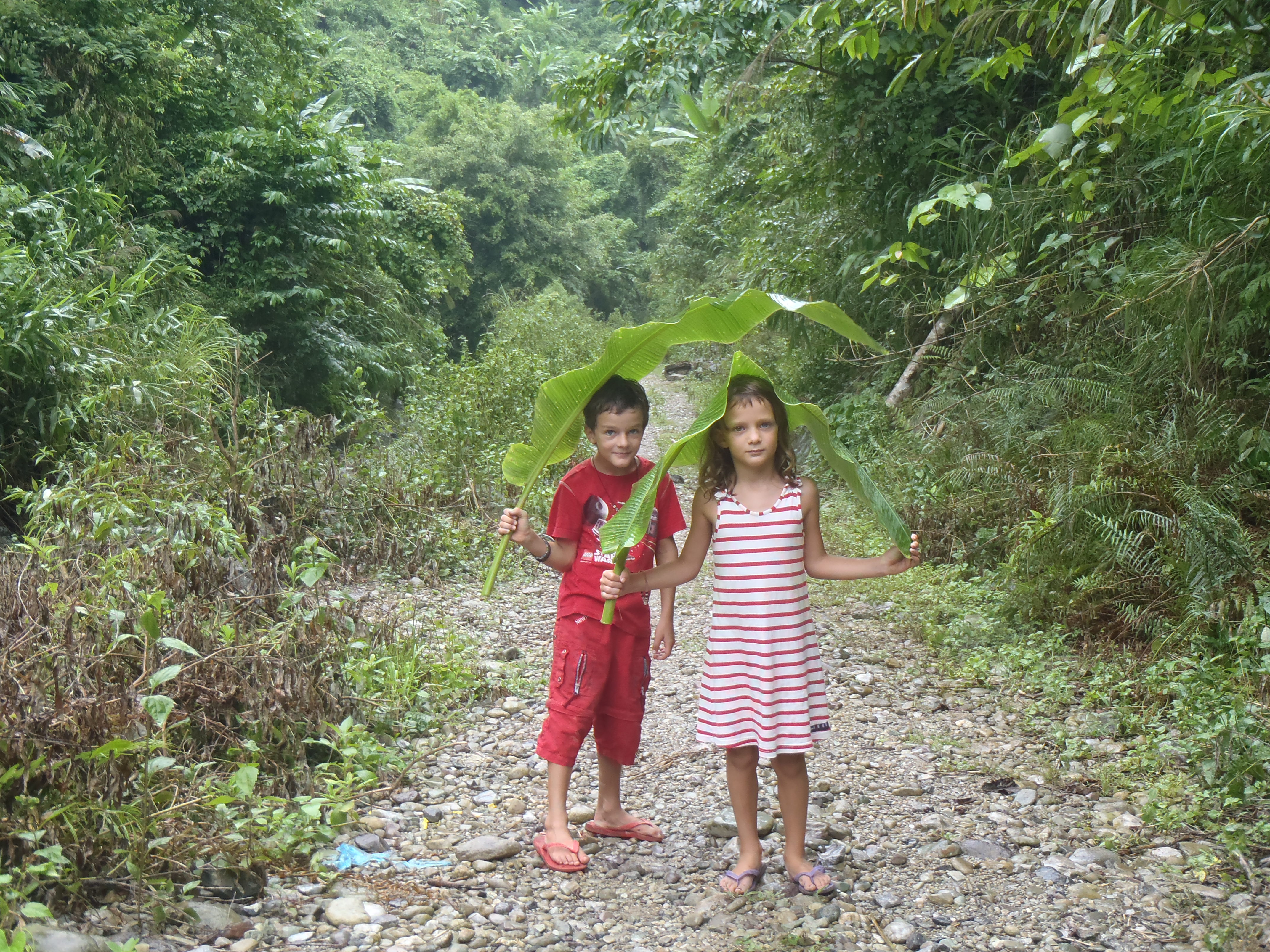Dire qu’on se posait la question de s’y arrêter ou pas… sans aucuns regrets ! Nous avons adoré… La Maylin guest house est tout ce qu’on aime, petits prix, propriétaire qui ne se laisse pas faire (seule sa femme a le dessus !) assez sarcastique et parfois incompréhensible (un irlandais au fort accent), un grand restau qui permet de discuter facilement avec les autres visiteurs, un jardin immense dans lequel les enfants ramassaient des fleurs pour les jeter d’un petit pont qui traversait un cours d’eau et au bout duquel se trouvait une balançoire au bord des rizières…L’environnement était idéal pour que Maceo puisse travailler avec son père tandis qu’Hannah peignait ou traçait des lignes obliques ! Parfait également pour mon premier mal de ventre…. Vraisemblablement le sandwich de la halte du bus précédent n’était pas frais, j’ai rapidement eu mal au cœur mais je pensais que c’était dû aux virages…. Bref, 24H de bonnes grandes douleurs et quand la fièvre est montée, j’ai appliqué à la lettre l’ordonnance de l’hôpital Nord de Marseille : 4 comprimés de zitromax en une seule prise ! et tout est rentré dans l’ordre dès le lendemain ! Cure de riz intensive en parallèle !