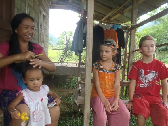 On s’est réfugié chez une habitante lorsqu’une grosse averse est tombée, les enfants avaient apporté plein de petits jouets et lui ont offert crayons de couleurs et petit poney. Sa mère a sorti deux chaises de sa maison pour qu’on s’assoit, (elle avait si peu de meubles ! …. On a discuté, difficilement puisqu’il y a la barrière de la langue. Sa petite fille s’appelle ANNA aussi, c’était rigolo ! Un chouette moment… A Vang Vieng, il doit encore y avoir une vingtaine de grottes à visiter, plein d’autres activités (escalades, treks, kayaking…). On s’est arrêté là pour continuer notre route vers le Nord. Difficile de quitter un lieu pareil, assurément un de nos gros coups de cœur au Laos !