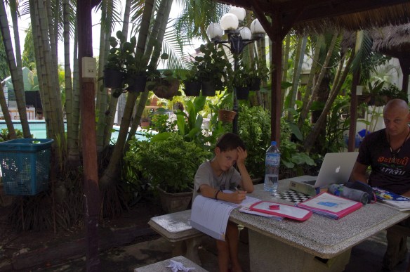 Arrivés dimanche 2 septembre à Vientiane, nous avons réservé un petit hôtel avec piscine et comptons y rester deux nuits avant d’aller plus au Nord… 2 buts principaux : laisser le temps à Maceo de faire ses deux premières évaluations de français et maths qui doivent être postées et se mettre dans l’ambiance lao…