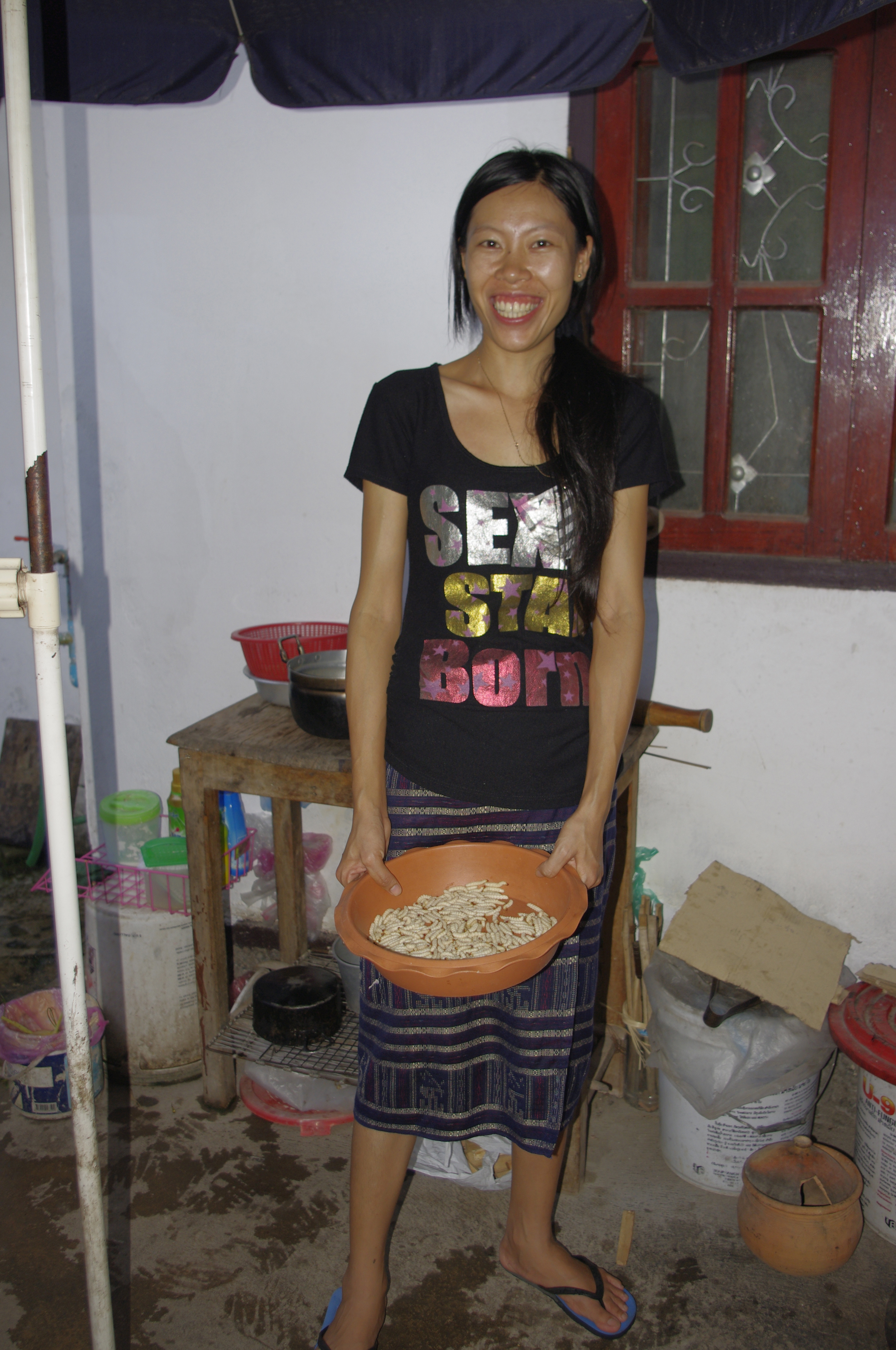 La famille de l’hôtel où nous étions ne faisait pas restaurant, en revanche notre chambre donnait dans la cuisine, enfin dans la cour dans laquelle toute la famille préparait leurs repas, et si on est parti en courant lors du découpage d’un RAT (des champs –mais cela ne change rien- je n’ai même pas pu le prendre en photo !!), on a accepté de tester des larves cuites, qui étaient bien grouillantes dans le plat avant la cuisson … et comme Hannah et Maceo ont goûté et avalé sans problèmes ces bestioles, je m’y suis mise aussi ! et en fait, c’est pas mal, ça croustille et on ne peut pas dire que cela est mauvais goût ! La téméraire Hannah a mis fini l’assiette !