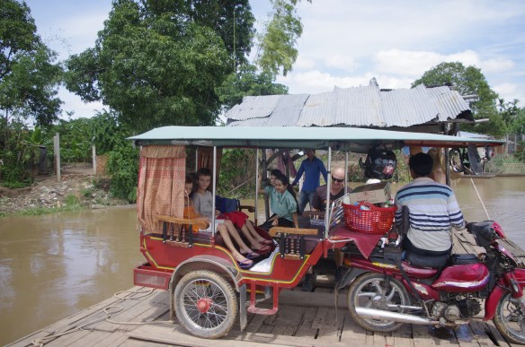 On est 8 dans le tuk-tuk et on doit traverser la rivière car Rathany habite sur une ile.