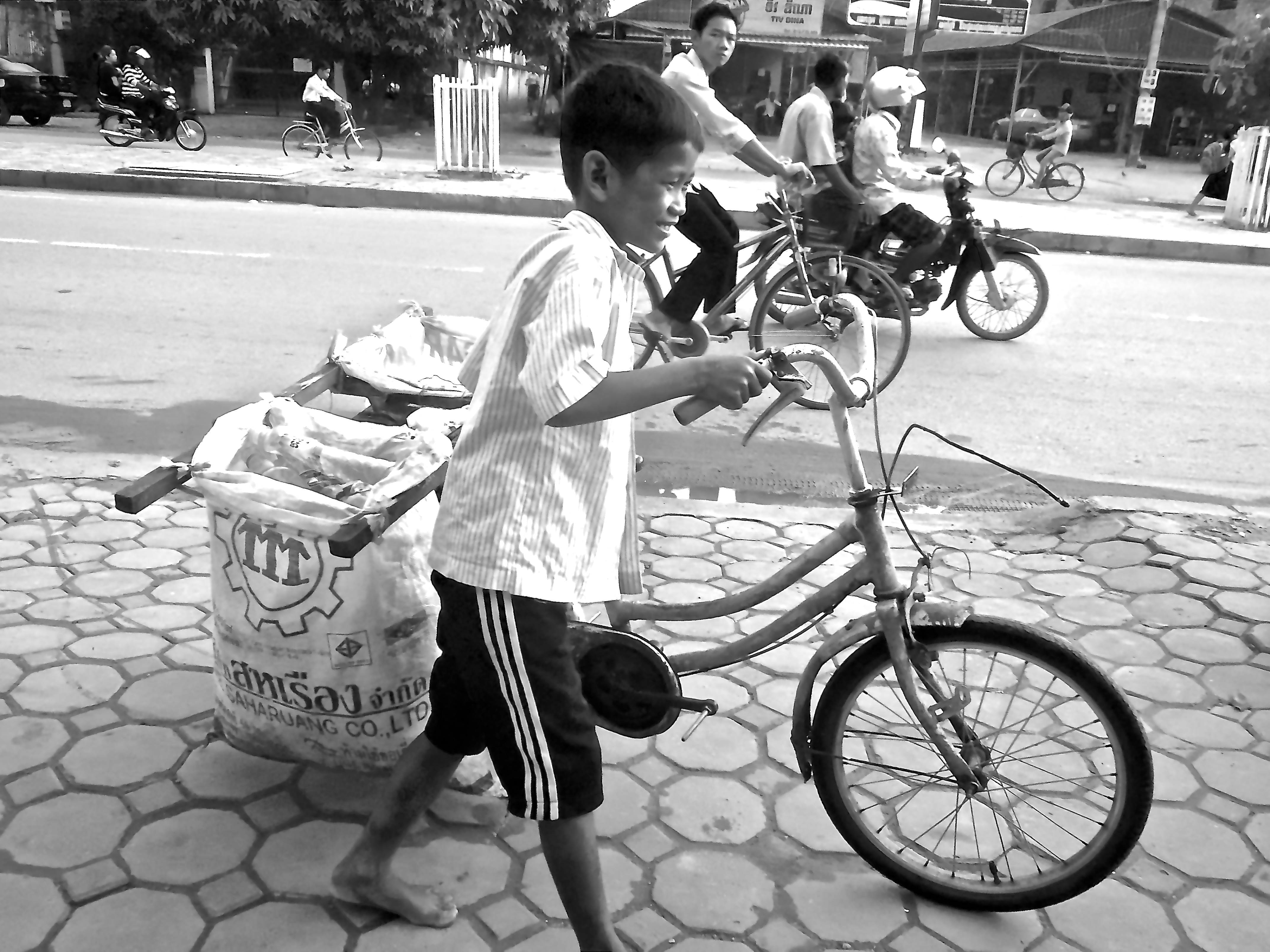 Un petit gamin des rues arrive avec son vélo et ses deux sacs poubelles à l’arrière. Il fouille les poubelles et récupère les bouteilles en plastique, sans doute pour les revendre (une misère). Il nous reste quelques jouets des enfants dont un jeu de quilles en bois (tu vois Erwan, tes cadeaux se recyclent même au Cambodge!). Maceo l’offre à l’enfant; pendant ce temps, un autre petit arrive, puis un troisième… Ils installent immédiatement le jeu par terre et se mettent à jouer avec les nôtres…