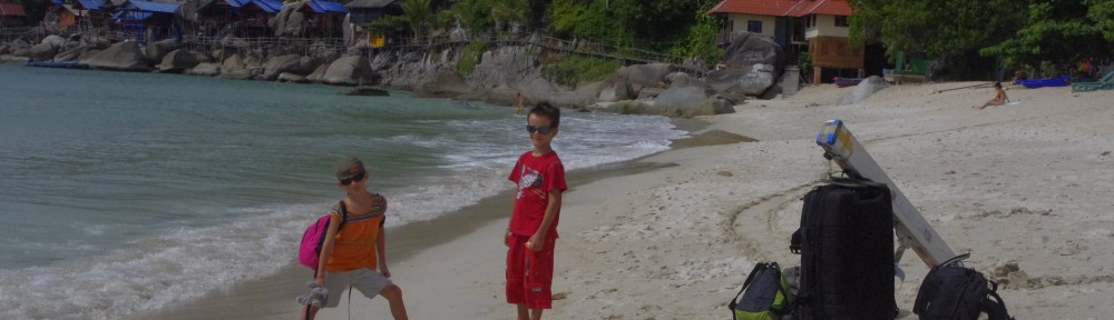 Dans la catégorie super utiles: la trousse de toilette légère et fonctionnelle qui s’accroche partout. Le savon de marseille qui lave vêtements et corps. Un matelas gonflable Thermarest, très pratique quand on ne trouve que des chambres avec 1 lit double ou quand Maceo en a assez de dormir tête bêche avec sa soeur. Des draps sac-à-viande pour éviter le contact direct avec certaines couvertures. Des foutas (ou serviettes de plage), genre de paréo épais, qui servent aussi bien à s’allonger qu’à se sécher… Les Sacs-en-sacs (bien moins chers chez Decat qu’au Vieux Campeur): hermétiques, ils contiennent chacun les affaires d’une personne (hyper pratique pour chercher!)+ les cours du CNED. L’ordinateur (c’est la 1ere fois qu’on voyage avec, et c’est quand même bien plus agréable que les internet cafés), la tablette qui contient dessins animés et jeux (utile pour les longs transports), le disque dur waterproof et shockproof (2 chutes déjà!), le petit appareil photo waterproof et shockproof (3 chutes et testé xxx fois sous la pluie; les photos rendent moins bien mais on peut le prendre partout avec nous).