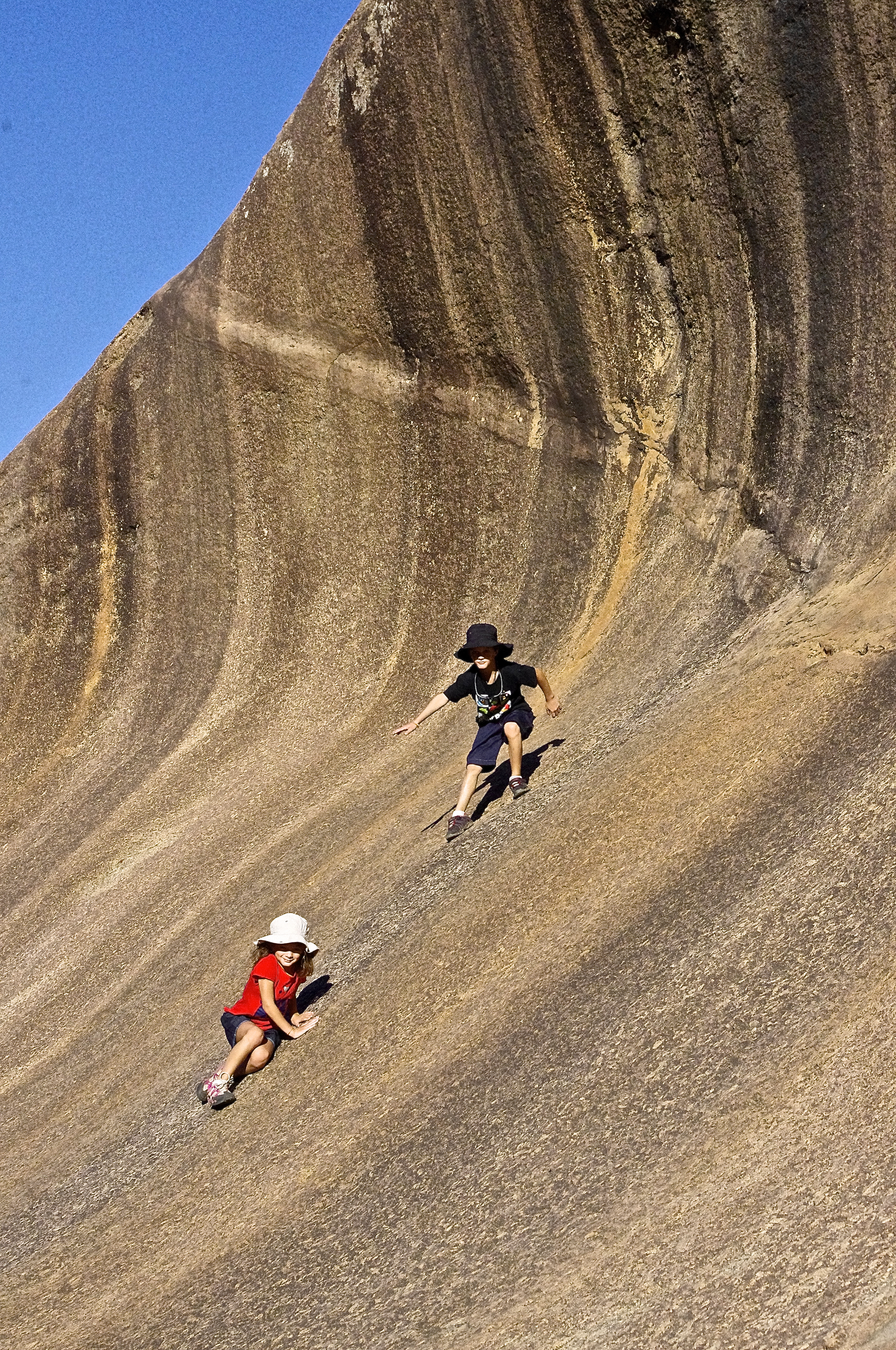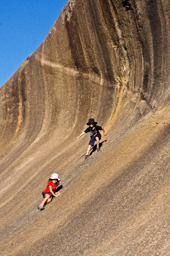 On fait un tour, et on voit nos 1ers kangourous vivants…les enfants sont ravis ! Le Rocher de la Vague est impressionnant, 110 m de long sur 15 mètres de haut.