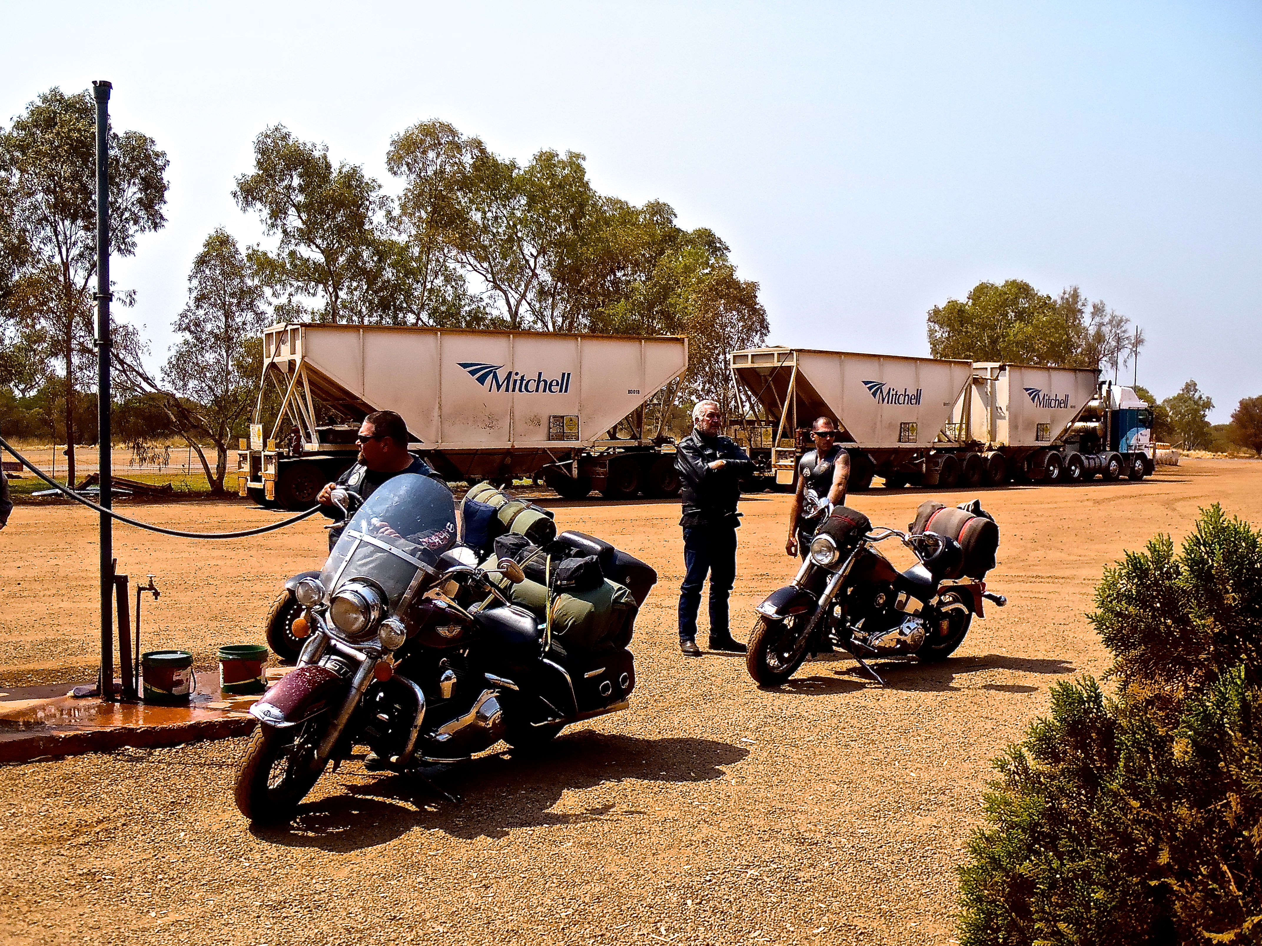 • doubler les road-trains : ce sont le plus souvent des camions dont la cabine est suivie au moins de trois remorques, ou alors des oversized qui transportent, soit des engins de chantiers immenses (une roue fait plus de 2.5 mètres de haut), soit des maisons, sorte d’algécos gigantesques! Pour les doubler, il faut donc s’organiser, car plusieurs centaines de mètres sont nécessaires…quand le road train dépasse les 40 mètres, même si on voit que la route est dégagée au loin, il ne faut pas se louper… On fait donc des calculs savants, on regarde devant, bien à droite, bien à gauche et on se lance! Quant aux oversized, ils sont accompagnés de voitures balais qui clignotent si on peut passer… la communication entre la voiture de devant et celle de derrière se fait par talkie walkie, donc on imagine que la voiture de devant a donné son feu vert ; mais sans visibilité, on n’a pas tenté!  En plus, ces road trains roulent assez vite entre 90 et 100 kms/heure et la limitation de vitesse est de 110 pour tous.