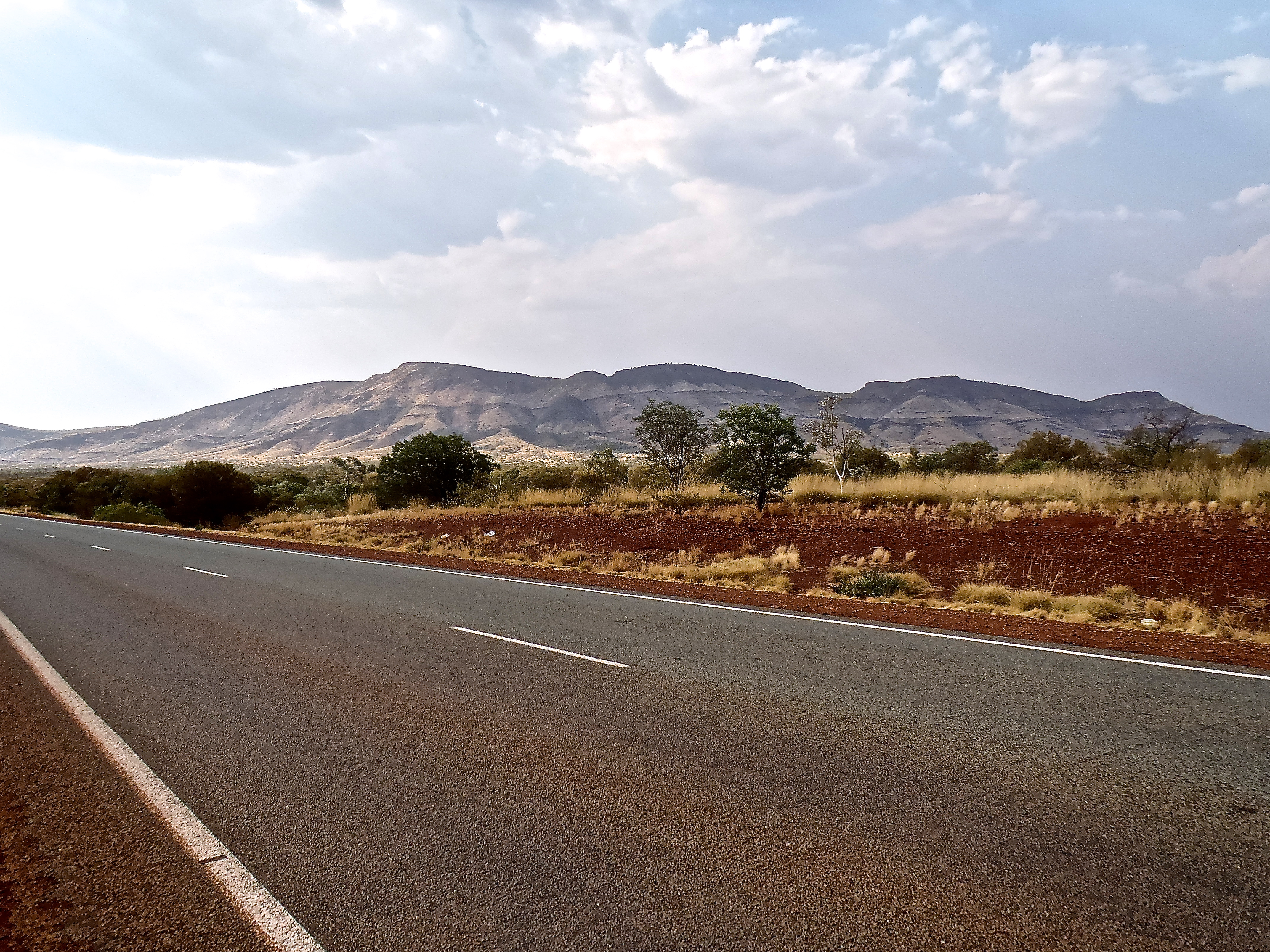 La route pour le Karijini National Park se compose  de deux parties: des petites routes pendant 250 kilomètres, puis une longue ligne droite pendant 1100 kilomètres! Tout un programme….