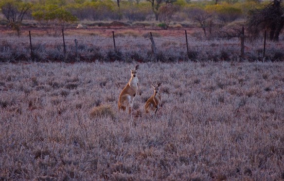 La soirée est excellente, on mange bien (merci le chef !), il fait bon, il y a moins de mouches, on a de la place et on est presque propre.. Que demander de mieux ? Ah si, on observe les kangourous passer le long de la barrière ; il y a un point d’eau plus loin qui les attire…