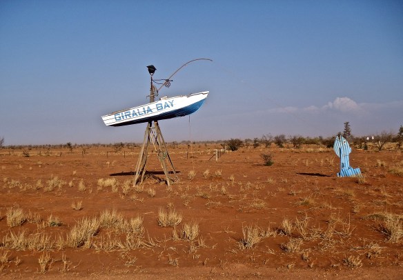On arrive à Girilia Station en fin d’après-midi, un bateau nous accueille indiquant Giralia Bay : on ne comprend pas pourquoi puisque la « station » est en plein désert et que la mer semble en effet proche sur la carte, peut être 40 kms, mais loin de la ferme. On comprendra plus tard.