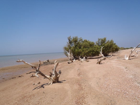 Et là, la terre rouge rencontre le sable blanc. La plage est superbe… des traces et des crottes de kangourous partout ; on est seuls au monde. Ce n’est pas le moment de tomber en panne ou de s’embourber. Il y a une petite ile en face, on rêve de se baigner, mais on est quand même très moyennement tentés par une morsure de requin. On pique-nique là et on télécharge quelques emails; c’est beau le modernisme!!!