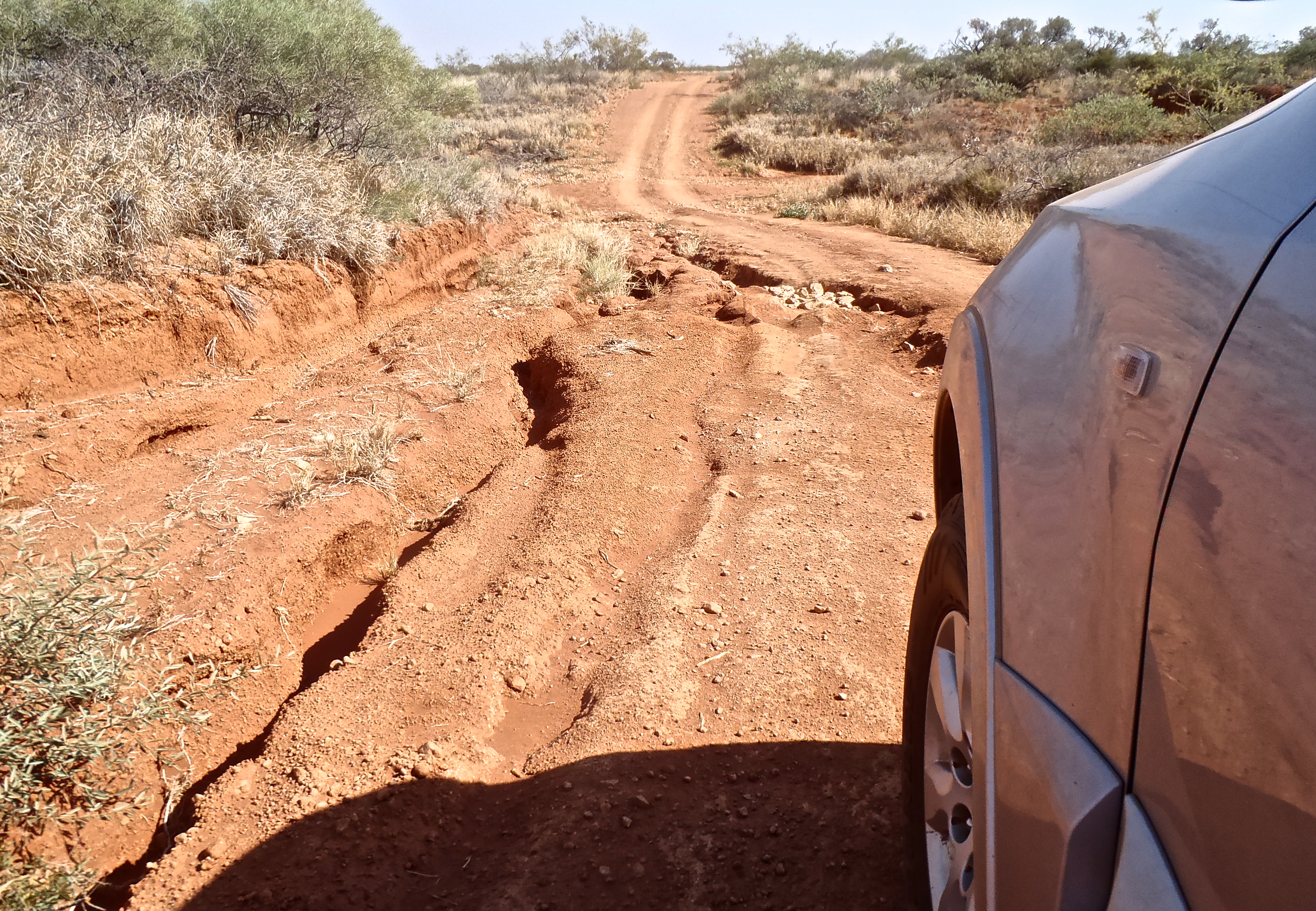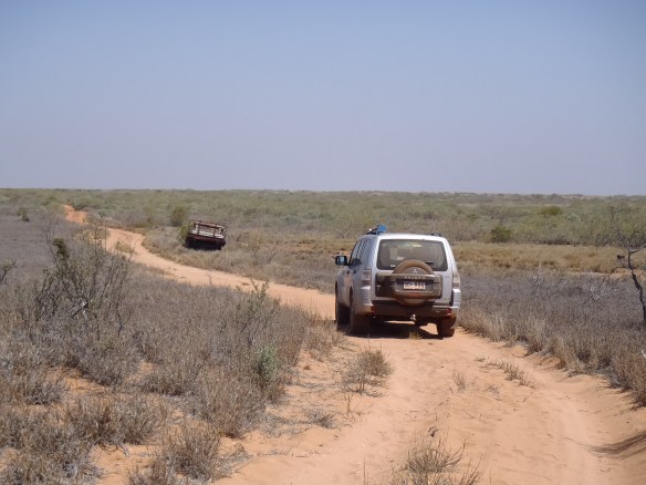 On repère un « beach access 4WD », et on se dit que puisque l’endroit est si sympa, on peut rester une journée de plus et aller à la plage avec notre 4*4. La propriétaire nous confirme que son terrain va jusqu’à la plage à 30 mns de route de là et puis à l’ouest sur encore 20 kms…. (quelques hectares donc).