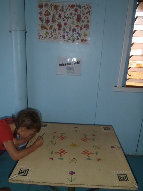 La propriétaire des lieux me dit que cela lui rappelle des souvenirs. Ses enfants sont en pension à Perth (1500 kms de là) mais elle a dans sa maison une « school room » puisqu’elle les a instruit pendant leurs années de primaire et de collège. L’école la plus proche est à Exmouth à 150 kms de là.