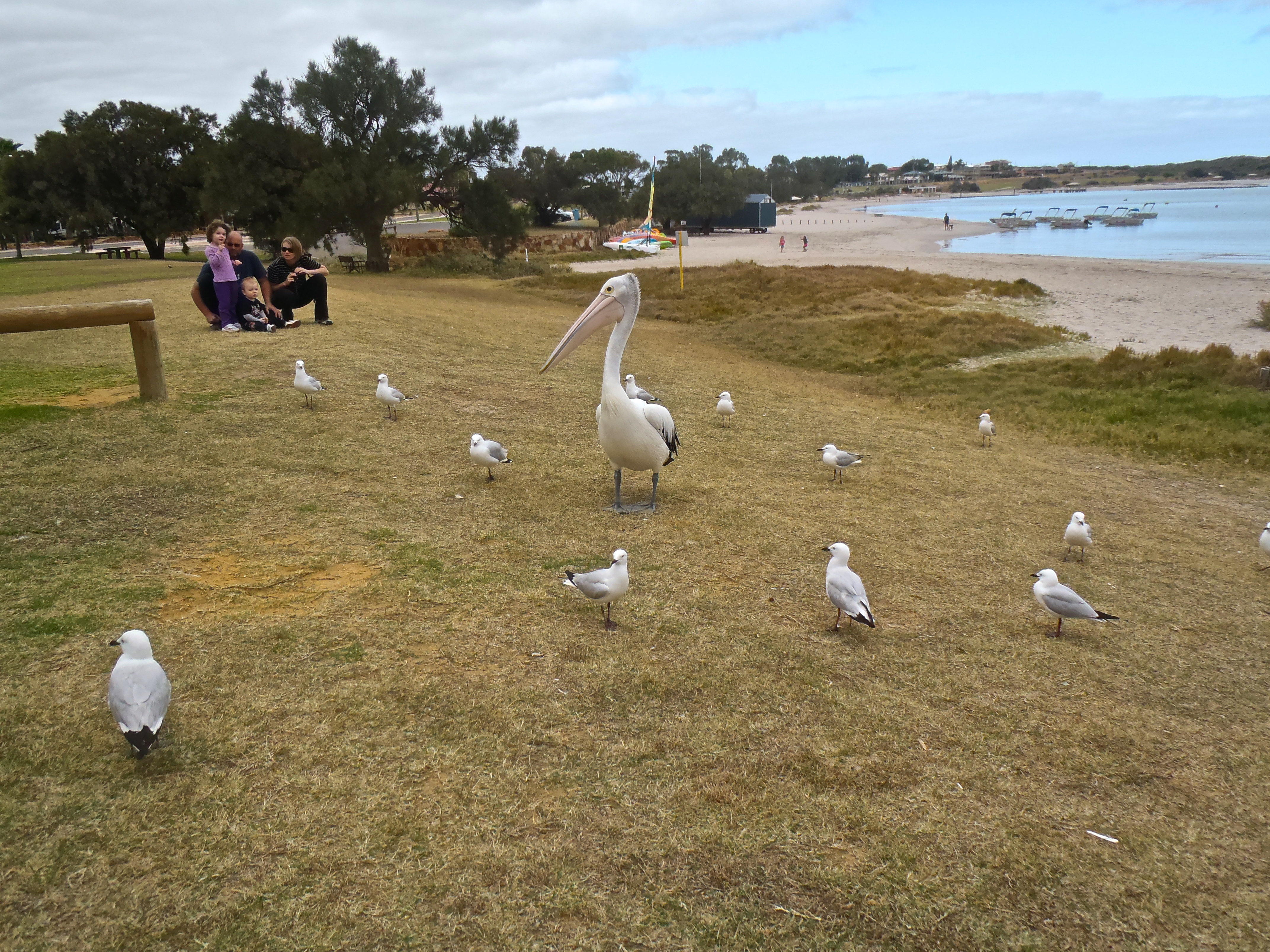 Le matin, avant l’école, on assiste au pelican feeding, décidemment c’est la mode de nourrir les animaux sur la côte ouest australienne. C’est assez drôle puisqu’il est écrit que les chiens sont interdits car ils pourraient effrayer les oiseaux.
