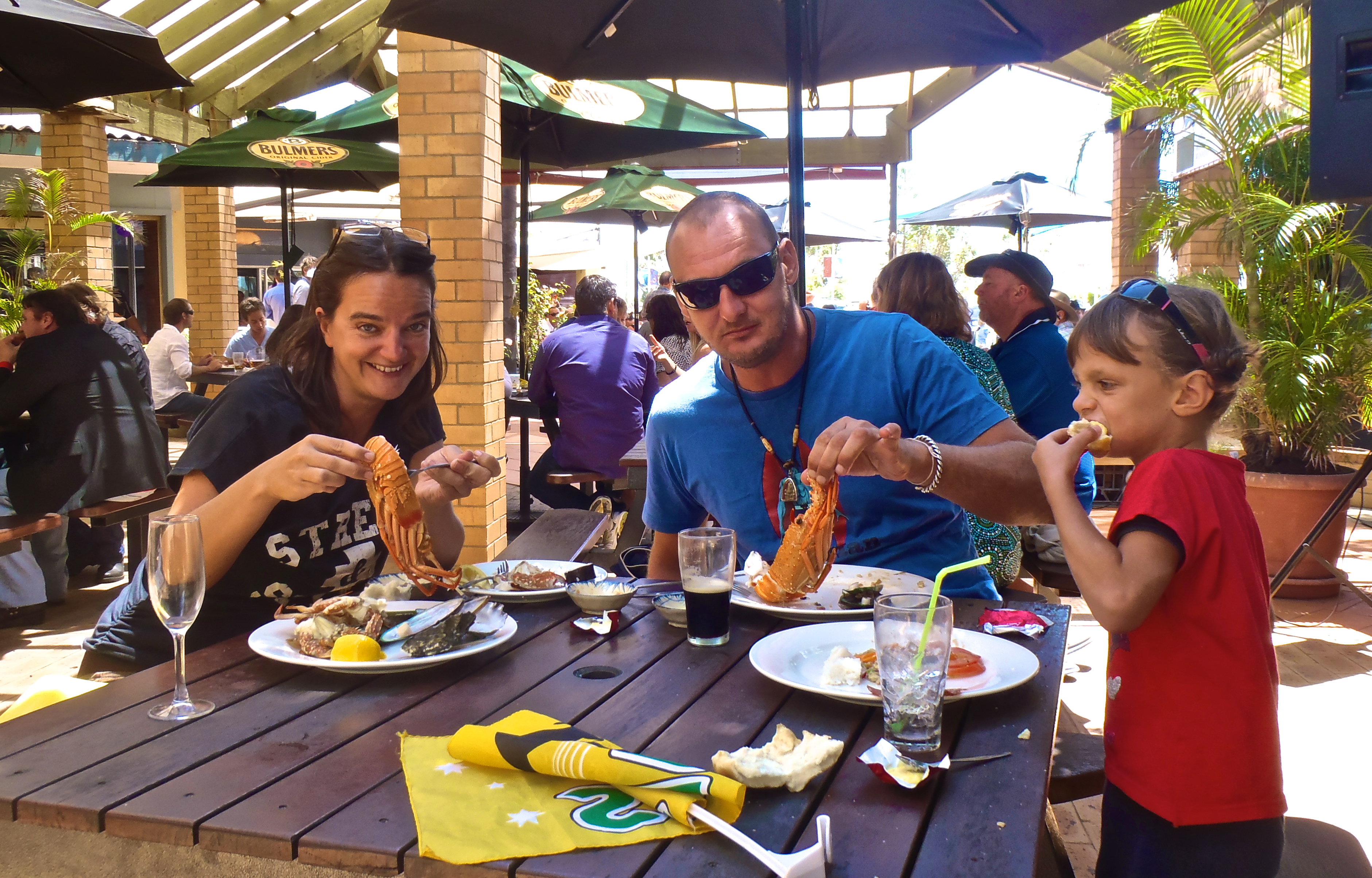 Après l’école, les enfants prennent leurs drapeaux australiens pour faire couleur locale et on dirige vers le pub. Les Australiens sont tous bien habillés, les femmes portent belles robes (très très courtes pour certaines !) et chapeaux chics … C’est la sortie classe de l’année !