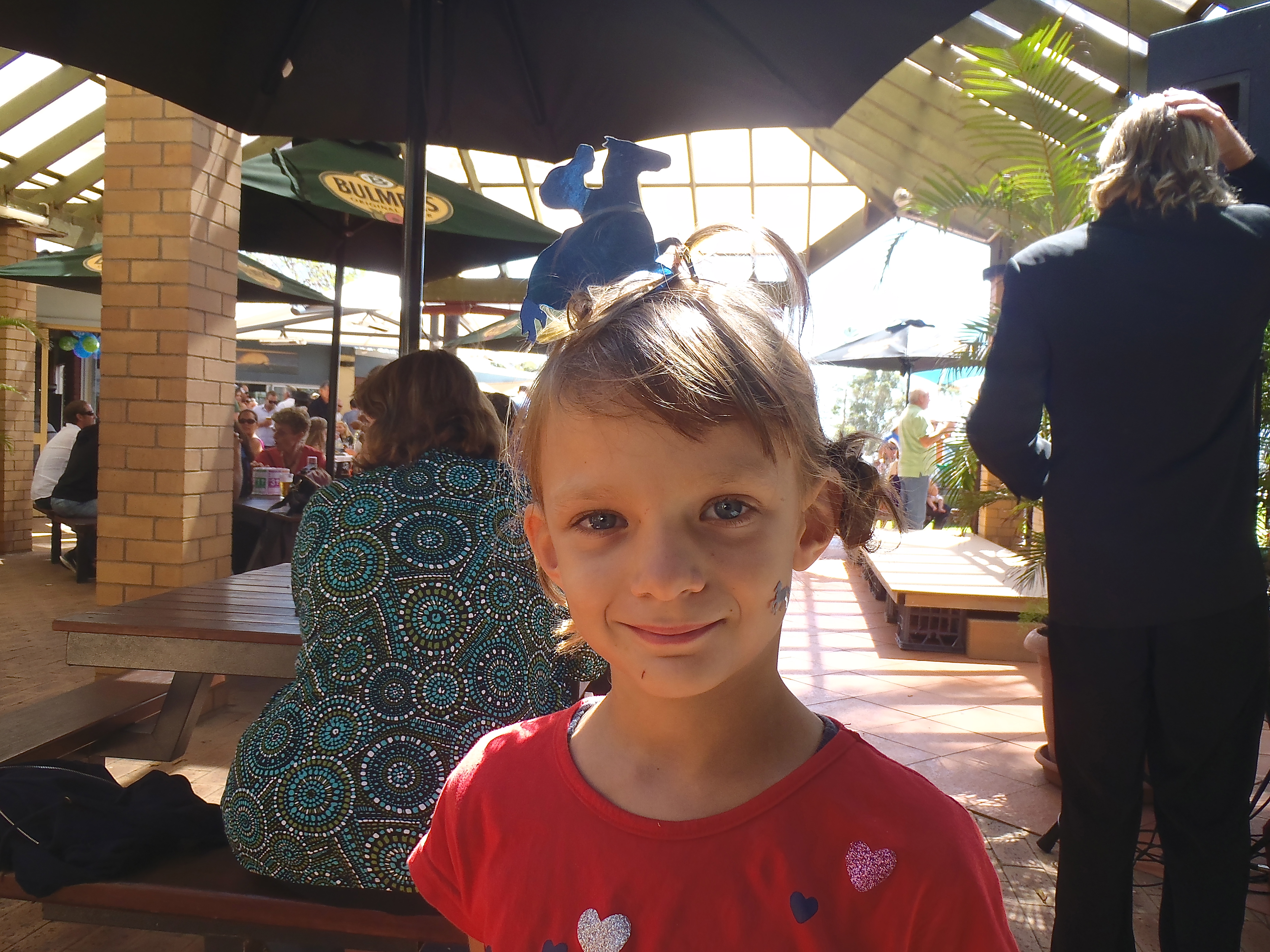 L’ambiance est très bonne, une vraie journée australienne ! Le pub a un extérieur très sympa, il y a d’autres jeunes enfants et de la bonne musique… Les Australiens enchainent les bières tandis que le défilé des plus beaux chapeaux de ces dames se prépare. On fabrique à Hannah un chapeau en 2 minutes avec un fer à cheval en carton doré et un cheval bleu (les deux éléments décoraient une table).