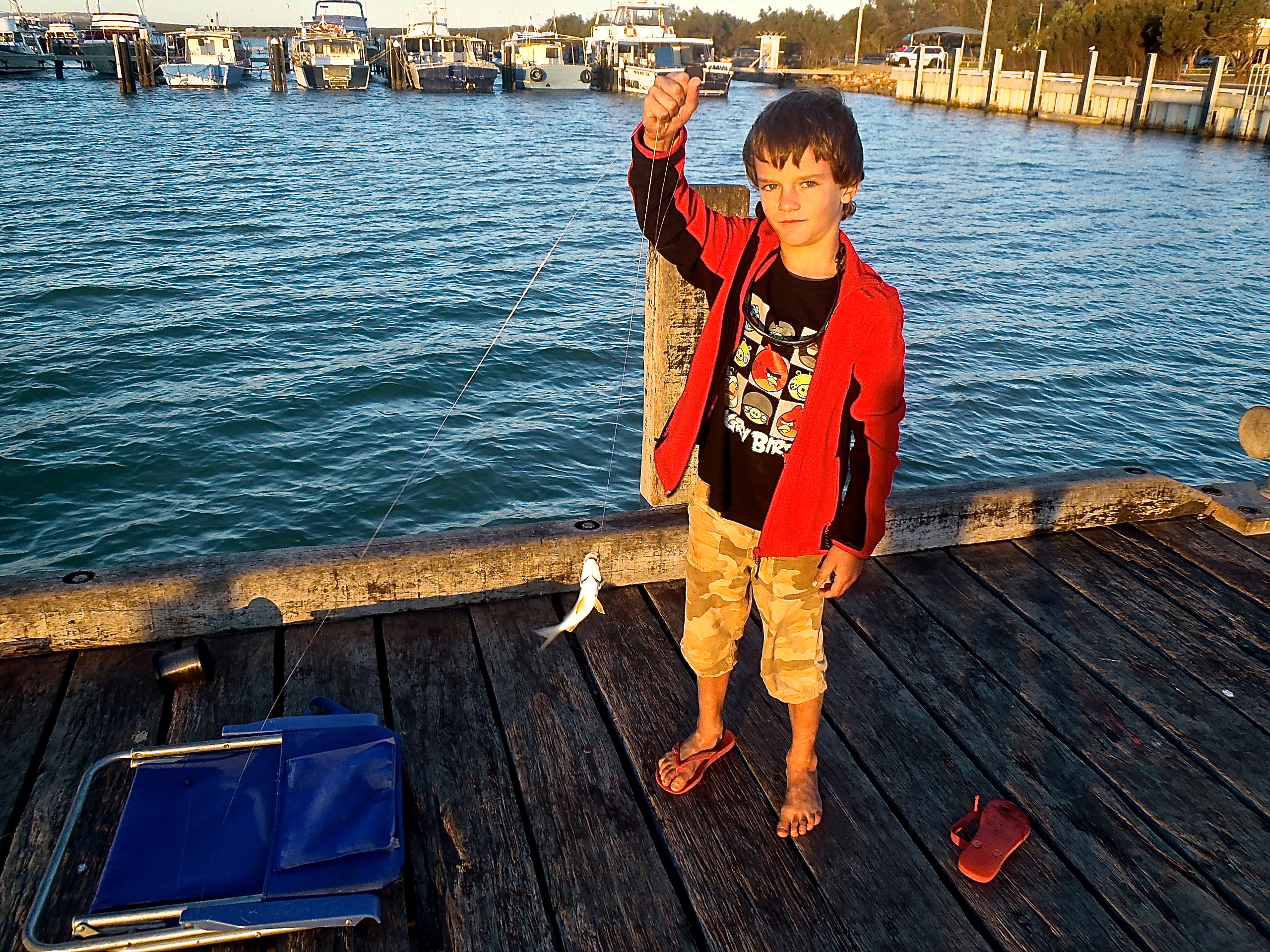 Maceo et Fabrice partent pécher en fin d’après-midi et Maceo pêche son premier poisson, pas immense, mais il est très fier ! Il en profite aussi pour casser sa tong ; ça paraît anecdotique mais en voyage au long cours, chaque objet, chaque vêtement compte. On peut passer de longues minutes à les chercher quand on les perd, car aucune chance d’avoir un(e) lampe/chaussure/chapeau de rechange ! On se rend compte aussi que les tongs d’Hannah sont trop petites aussi… un arrêt shopping va s’imposer !