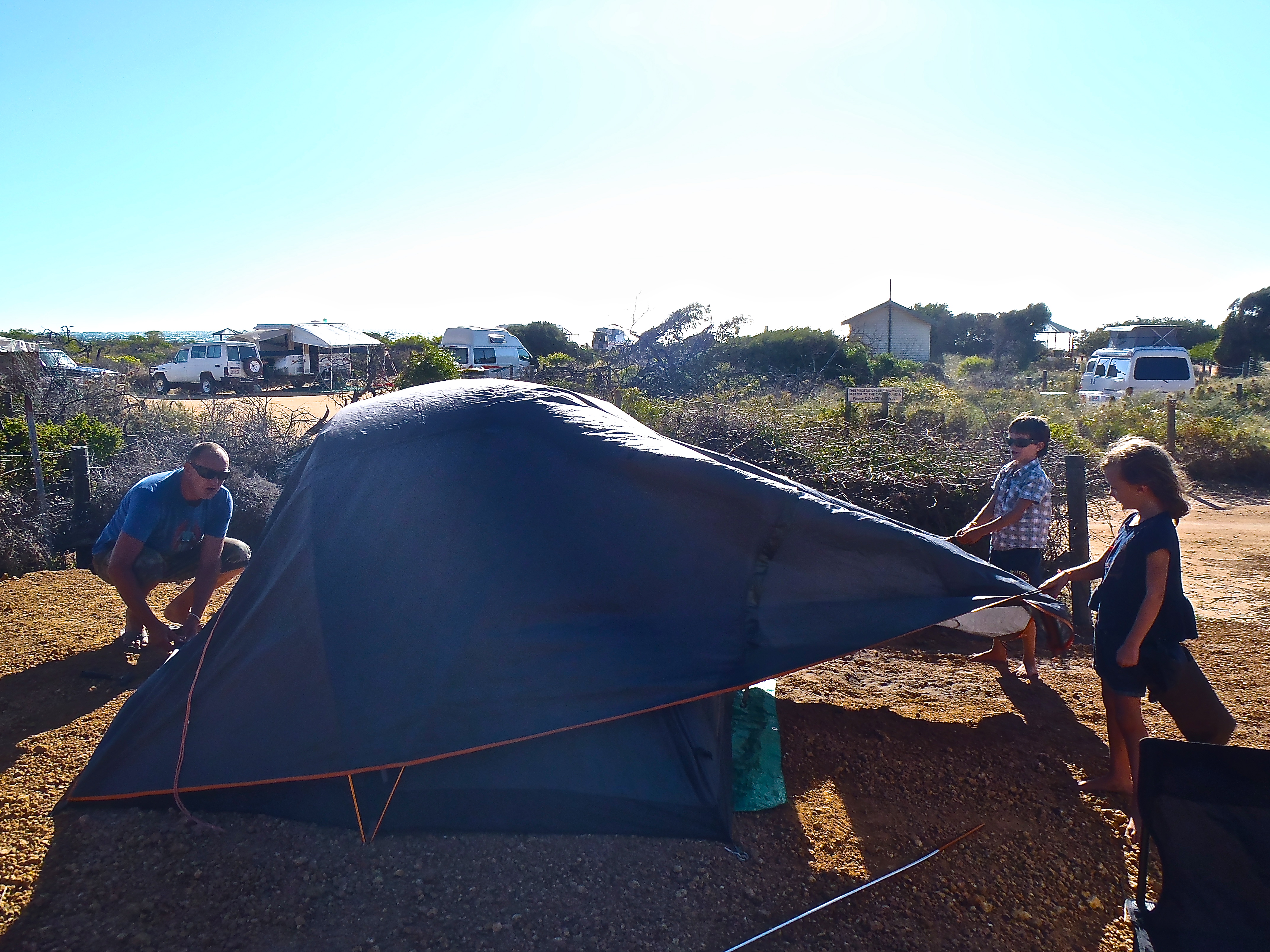 On s’arrête en chemin à Geraldton, la 2nde ville de l’état, 37000 habitants ! Retour à la civilisation garanti : mac do, PLUSIEURS supermarchés, magasins de vêtements… On remplace feu les tongs des enfants, maillot de bain pour Maceo (son troisième depuis le début du voyage !), caleçons pour les hommes et pince à épiler ! Et bien sur, l’éternel trio nourriture/glace/essence ! On se dirige vers les Pinnacles, parc national à 200 kms de Perth… plus que 4 jours dans cet état de l’ouest…