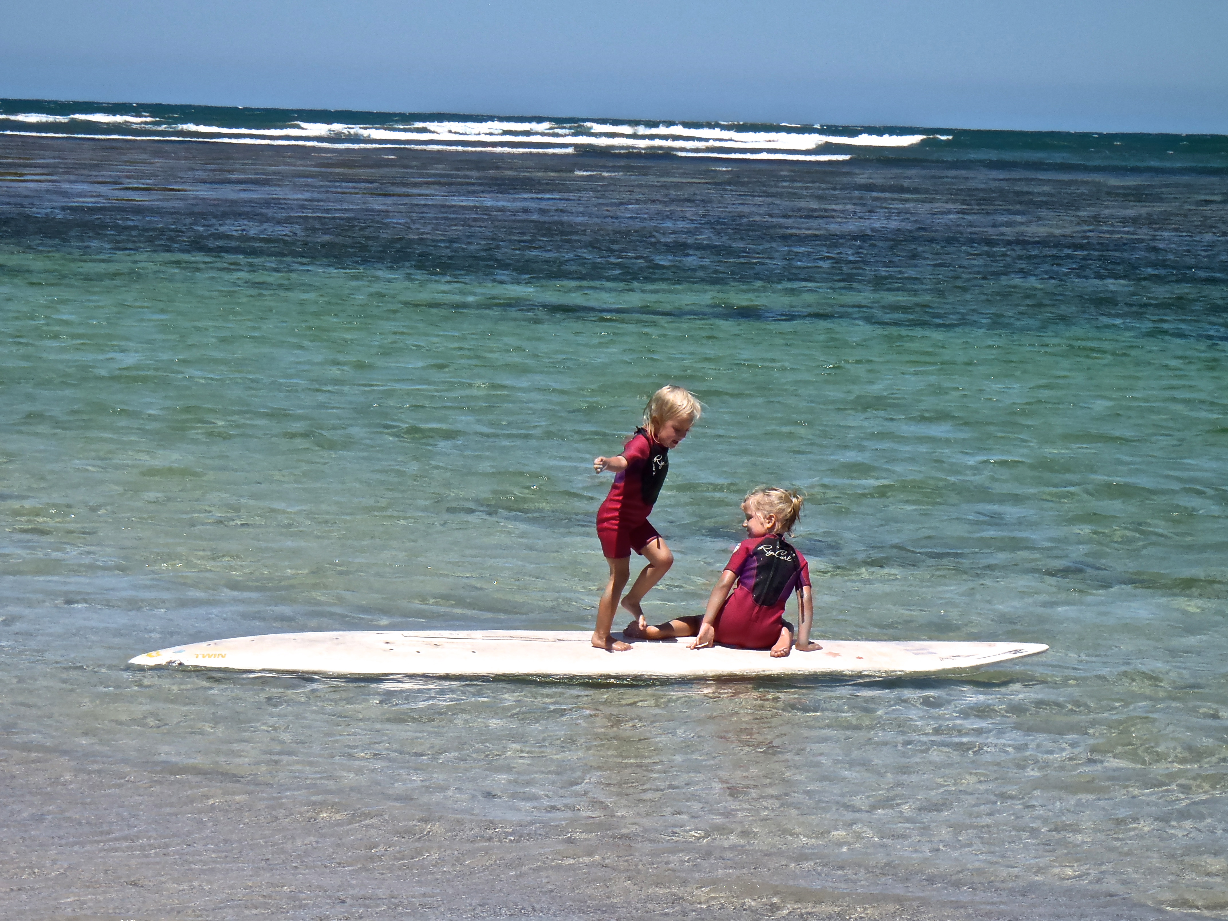 Des petites Australiennes sont entrainées par leur père aux 1ères initiations de surf : se tenir sur la planche, pagayer…