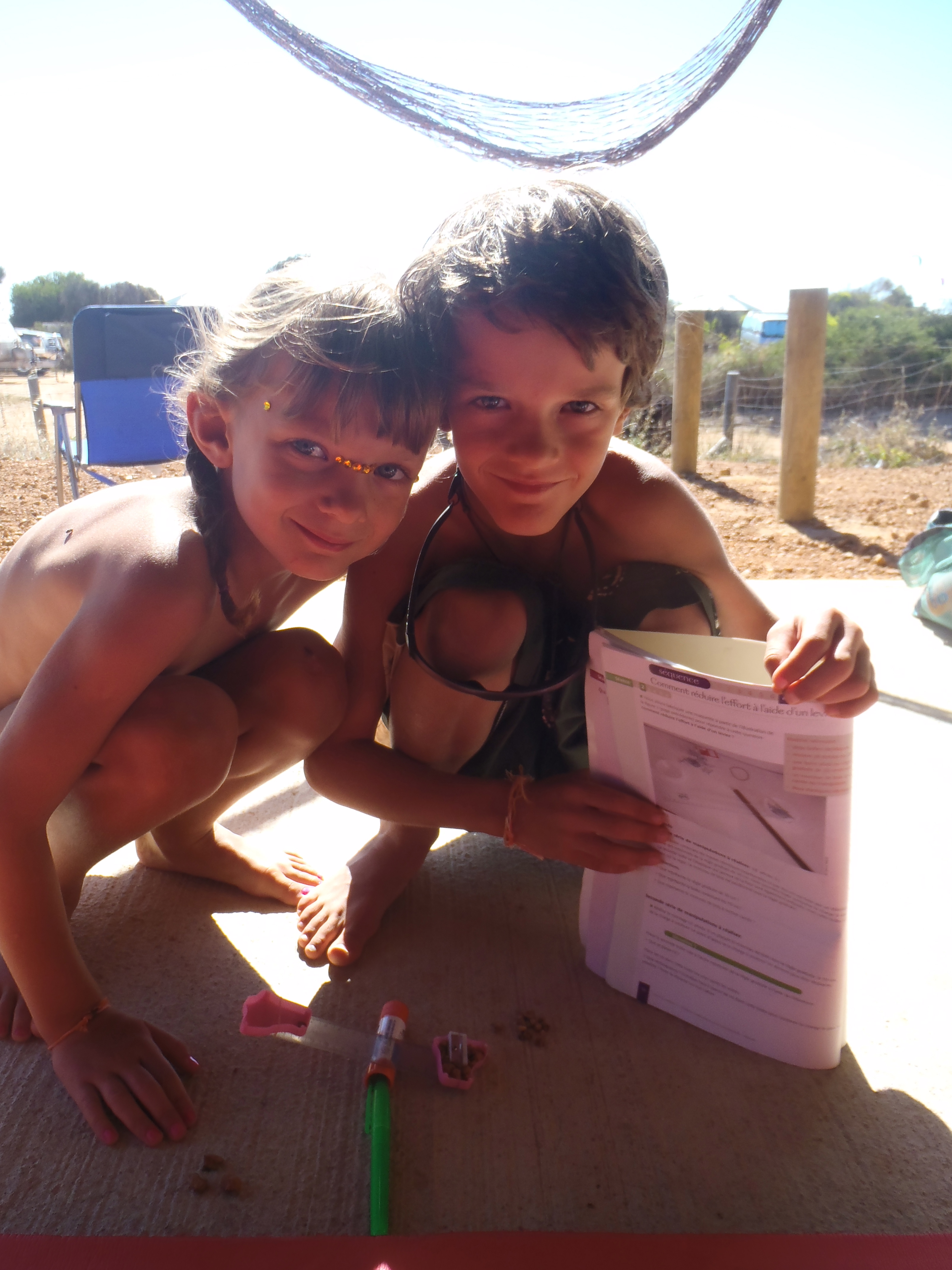 La leçon de sciences du jour pour Maceo parle des leviers et points d’appuis. Il faut faire une expérience avec boites en plastiques ; règle de 30 cms, élastiques et vis…. On ne peut pas dire qu’on ait tous les éléments, mais à l’idée de faire des expériences ; les enfants ont beaucoup d’imagination et sont motivés. On finit donc avec règle de 20 cms, élastiques, cailloux et taille-crayons ouvert en deux pour remplacer les boites… Les enfants réalisent toutes les expériences demandées et sont fiers de ce qu’ils ont appris !