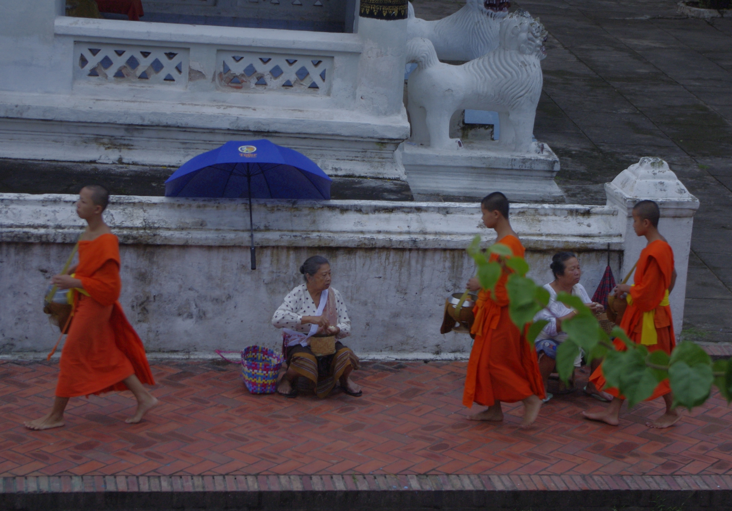 J’avais entendu dire que cette cérémonie était devenue un vrai business à touristes : normalement, nous ne sommes pas autorisés à donner à manger aux moines, en particulier les femmes non bouddhistes ; mais certains le feraient, tout comme d’autres se placeraient sur le trottoir sur lequel les moines passent pour les prendre de plus près en photos… Je ne sais pas si c’est l’endroit (pas tout à fait dans le centre ville) ou la période, mais nous n’avons rien vu de tout cela ; les personnes présentes qui observaient étaient placées en face, et plutôt discrètes.