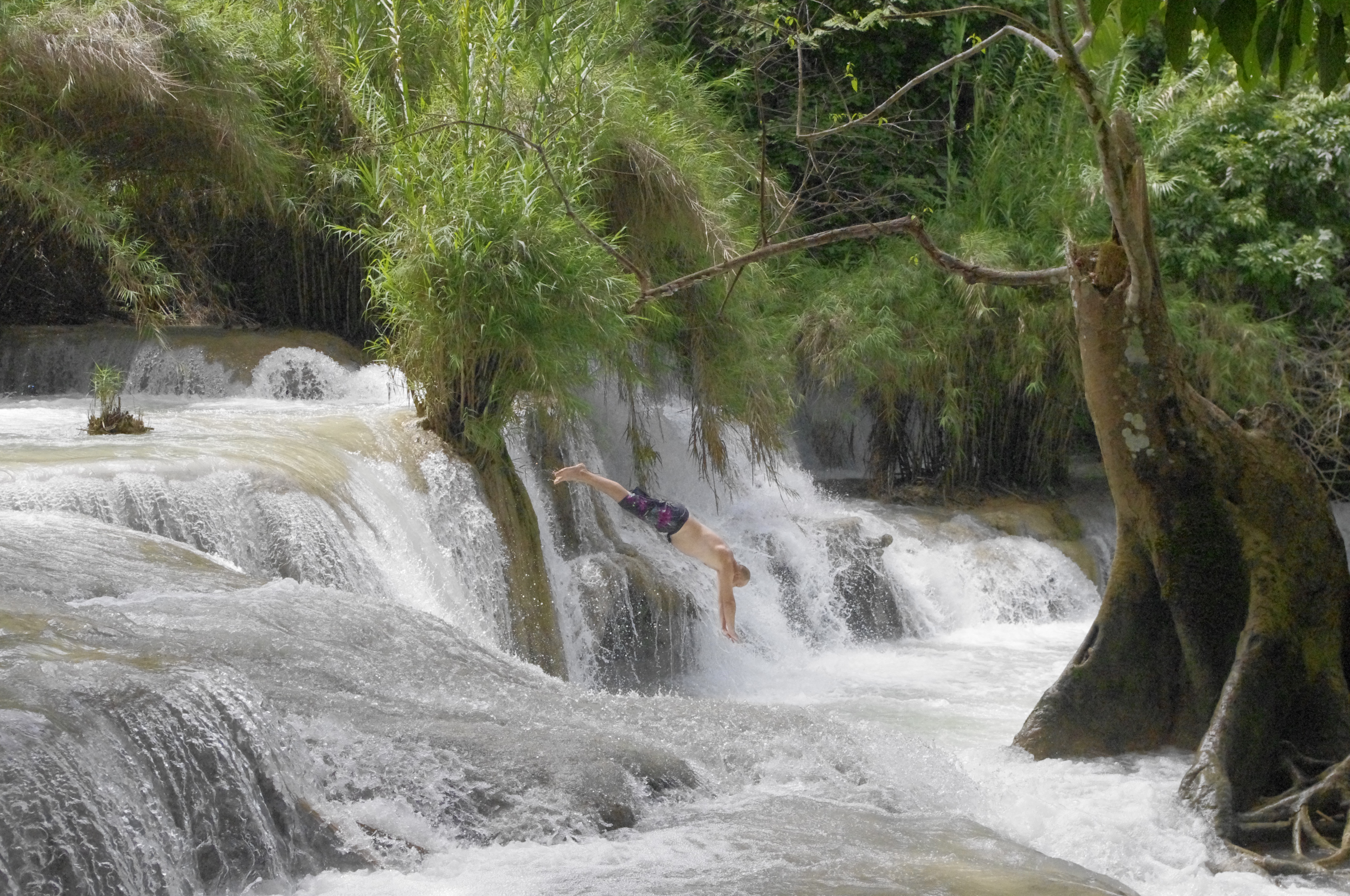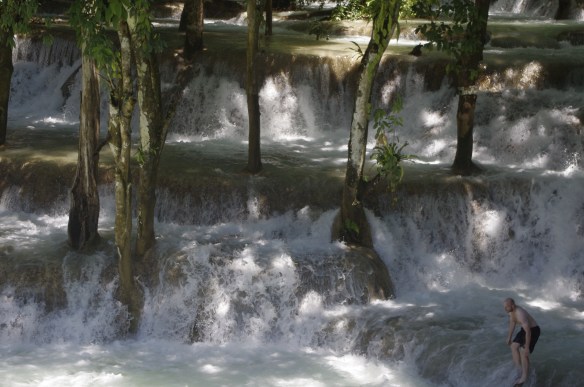 Et pour finir le dernier jour, un petit tour (en mini-bus organisé cette fois, 50000 kips par personne, les enfants ne payant pas) pour aller voir les chutes de Kouhang Si à une trentaine de kms de Luang Pradang… le chauffeur est odieux, on est obligé de suivre les horaires précisés et on se fera même klaxonner parce qu’on regardera les souvenirs au lieu de monter dans le bus à 15h tapantes (sauf que nous, on s’est mis au rythme lao et on n’a plus de montre…). A part cela, les chutes sont époustouflantes, il faut aller jusqu’en haut pour voir la grande cascade d’une hauteur de 30/40 mètres environ ! Tout au long de la descente, il y a 6 ou 7 bassins différents dans lesquels on peut se baigner ; on choisit celui qui a une liane pour se jeter à l’eau et on se jette à l’eau. Hannah n’essaye pas la liane et préfère se baigner dans le bassin. Maceo, en revanche, fait le singe et se jette de l’arbre sans difficultés… Quant à Fabrice et à moi, on y arrive mais avec moins de légèreté que notre fils ! Fabrice plonge tout de même de la cascade après avoir vu un local s’y mettre (il n’y a que qui connaissent bien les fonds !)