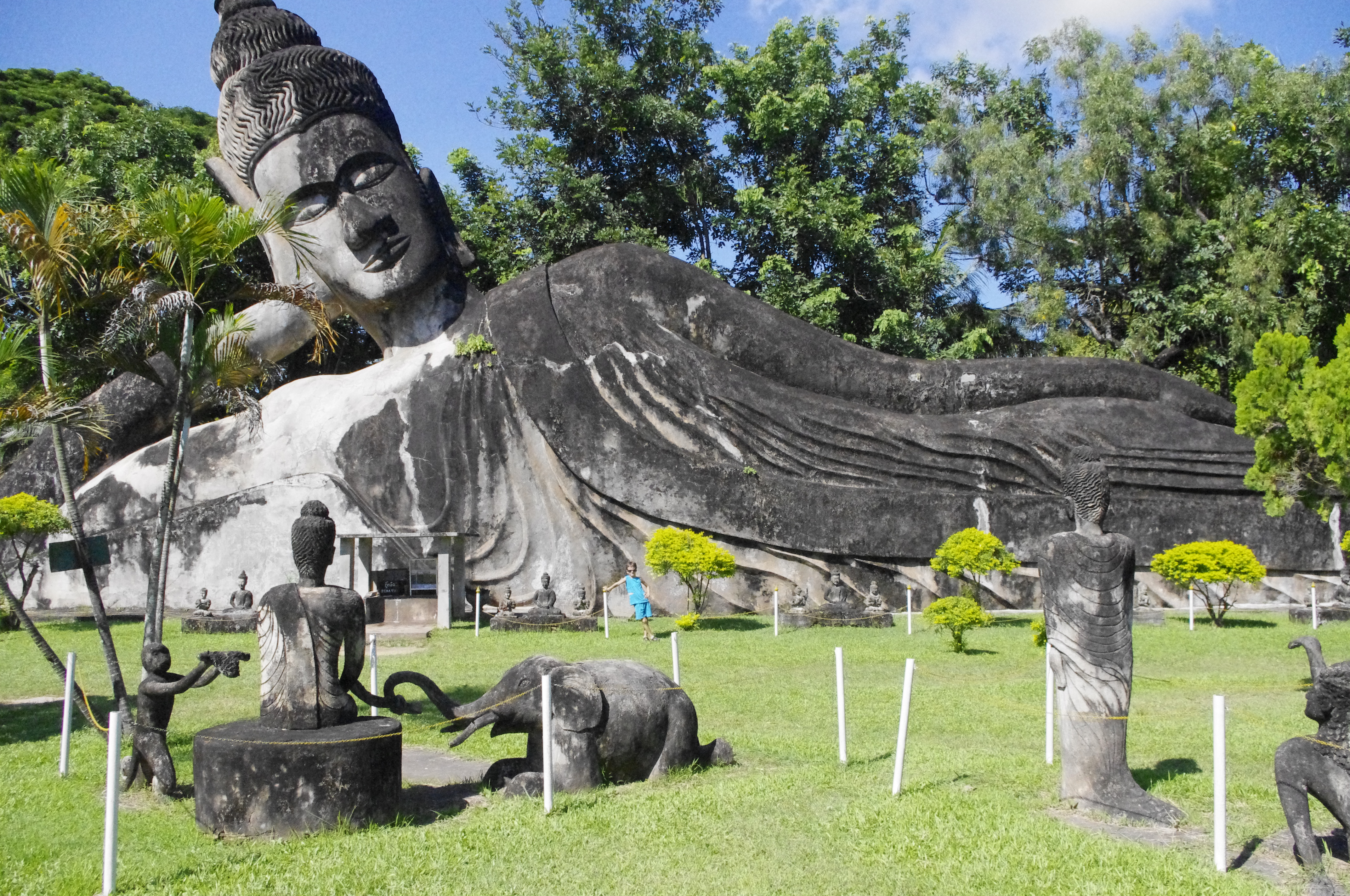 On visite également le parc de Bouddha, à 1 heure de tuk-tuk de la ville… très joli, mais sans plus pour les parents, en revanche, les enfants ont l’impression d’être des explorateurs à grimper sur un temple, à jouer à cache-cache derrière les statues d’éléphants à 3 têtes ou du Bouddha couché géant… Le summun étant une immense citrouille dont l’intérieur est composé de la Terre, de l’Enfer et du Paradis…on passe par les trois stades en grimpant puis descendant des escaliers (un vrai labyrinthe), des têtes de morts dans l’Enfer et des jolies statues au Paradis…On finit même sur le dessus de la Citrouille, comme d’habitude, mini barrière de 40 cms de hauteur en guise de garde-fou… il faut faire attention, mais la vue est splendide ! On joue à se faire peur dans le corps arrondi de la Citrouille, il faut se pencher pour sortir sur le toit, se courber dans les escaliers…