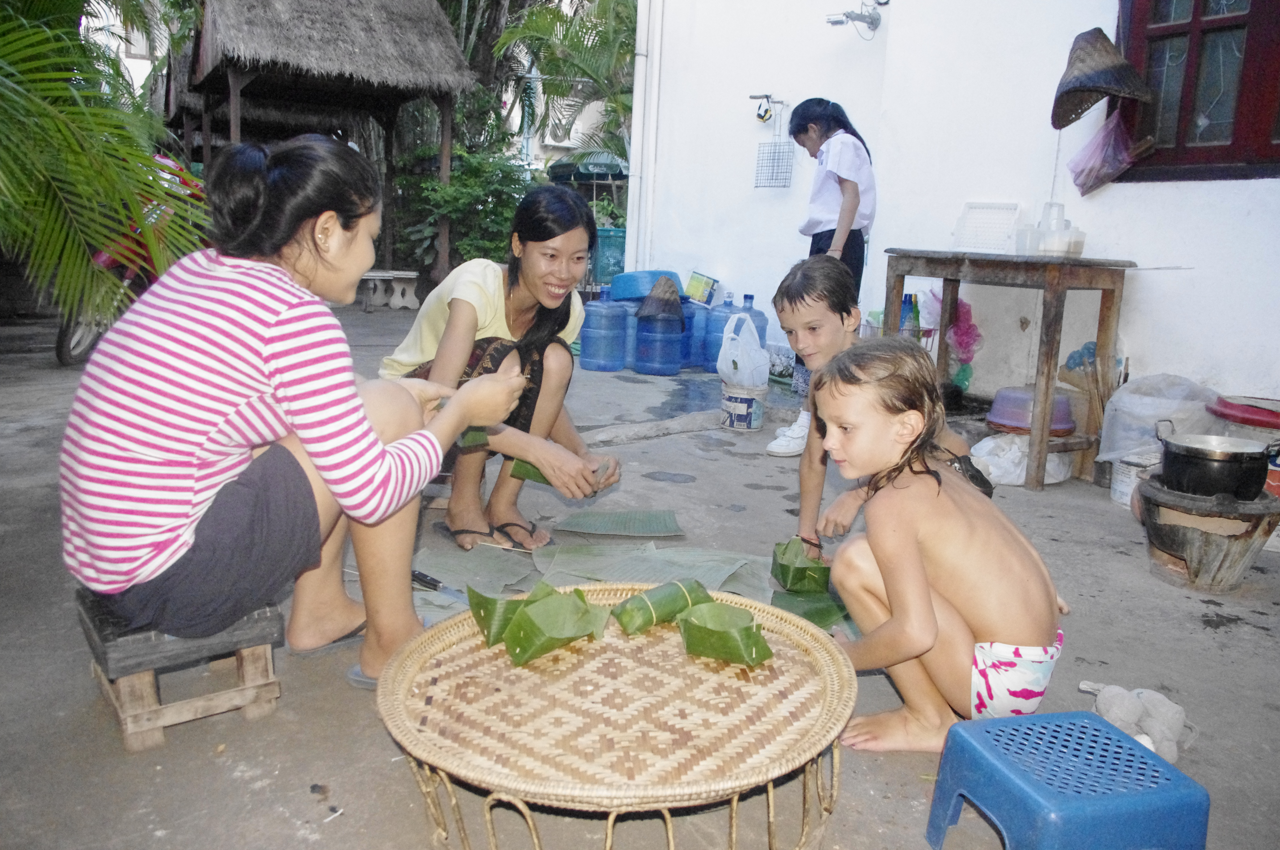 Les enfants travaillent bien ici surtout quand on promet une récréation-saut-dans-l’eau. Ils tentent de fabriquer des paniers pour la fête de Bouddha qui se prépare…