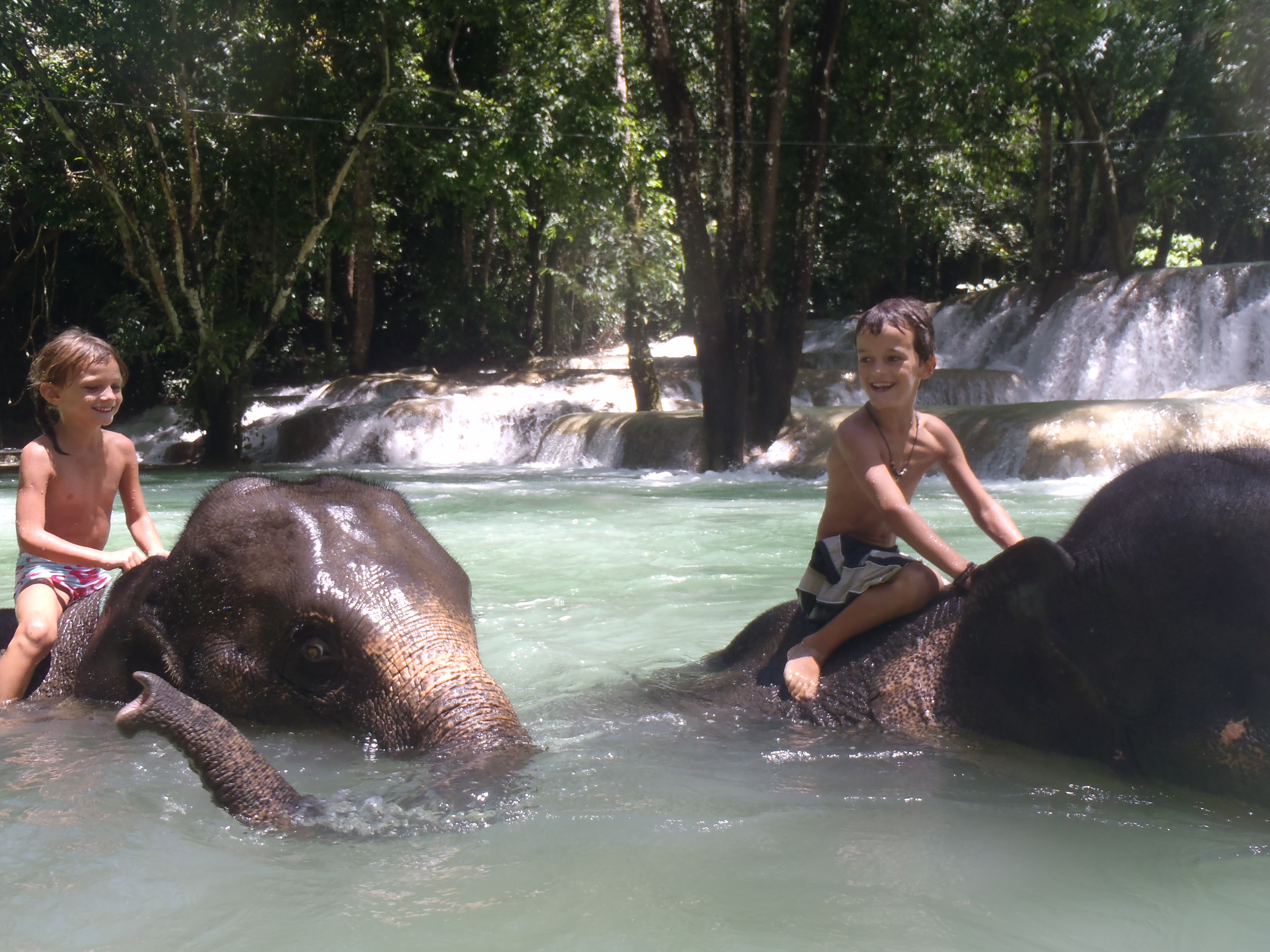 Bref, on décide de faire nos propres excursions en louant les services d’un tuk-tuk qu’on négocie correctement (15euros la journée) mais on aurait pu mieux faire (je suis sure qu’on aurait pu l’avoir à 10 !…) pour qu’il nous emmène aux chutes de Tad Sae et surtout pour qu’on aille voir, toucher, grimper sur, se baigner avec…. LES ELEPHANTS !!!! Les enfants qui, forcement sont à l’initiative de cette journée, sont surexcités… Nous un peu moins, la balade en éléphants c’est gentil, mais ça tangue et ça donne mal au cœur. En plus, les éléphants ont des gros poils qui grattent nos pieds quand on est dessus… Enfin, c’était la journée kids, alors allons-y avec le sourire !